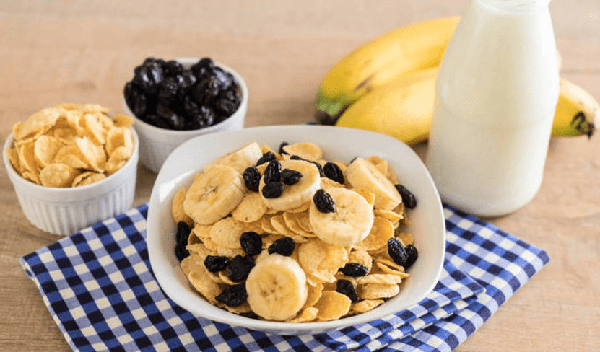 材料:全麥脆片、燕麥片、香蕉、果幹、牛奶