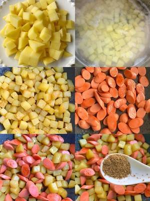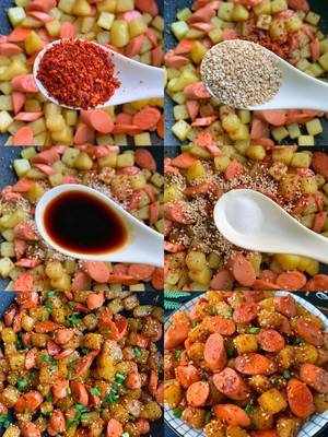 1:土豆削皮之後切成合適的大小,水開後鍋裡煮2-3分鐘,撈出瀝幹水,放少許油把土豆丁煎至焦黃盛出。2:火腿腸切片,放鍋中煎至微黃,再加入土豆丁混合,加入孜然粉