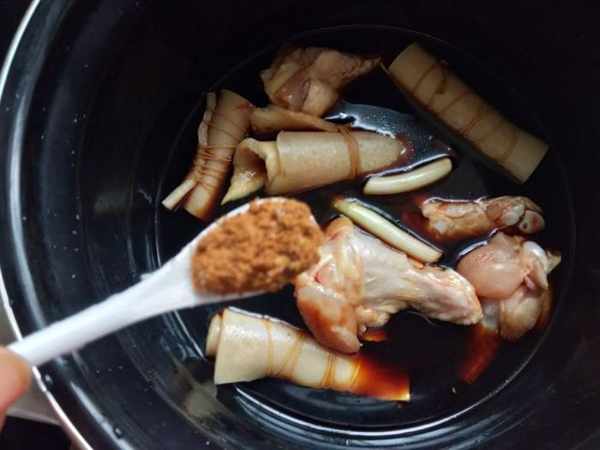 第五步:加入醬油紅燒醬油,紅糖,葱段,薑片,鹽,稍微放上一碗水,電壓力鍋蓋上蓋子,選擇猪蹄鍵就可以了。