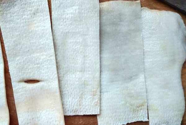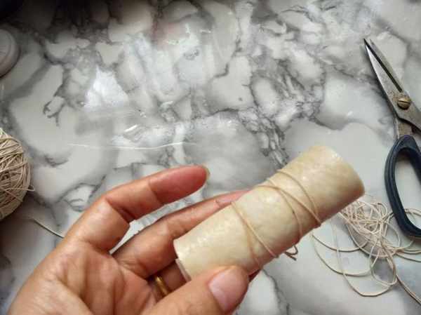 第三步:把猪皮切成小塊,卷起來用線繩捆綁成卷,直到全部處理完成。