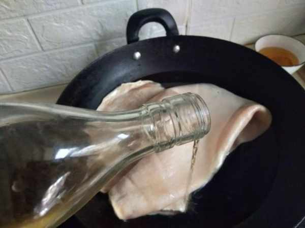 第一步:處理猪皮,把猪皮放到鍋裏,加入清水,葱,薑,料酒煮開,去掉异味。其實猪皮的營養也是相當的好,猪皮裏蛋白質含量是猪肉的2.5倍,而且90%以上是大分子膠原蛋白和彈性蛋白,其含量可與熊掌媲美。其中碳水化合物的含量比猪肉高4倍,而脂肪含量卻只有猪肉的1/2。尤其愛美的女生更要吃,猪皮中含有相當豐富的膠原蛋白,對皮膚健康有益,可以有效促進皮膚細胞吸收和貯存水分,防止皮膚乾癟起皺,使皮膚豐富飽滿平整光滑,還能使皮膚的彈性新增,韌性增强,减少皺紋的出現,皮膚顯得嬌嫩細膩又光滑。
