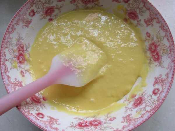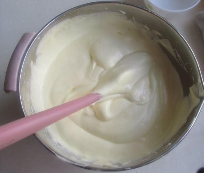 第七步:把蛋白霜分次放入蛋黃糊中拌勻,成為細膩的蛋糕糊。這個過程要翻拌,拌的時候要輕,快,以防止消泡。