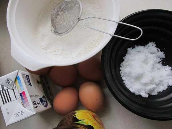 所用資料:低筋面粉80克,雞蛋4個,牛奶60克,玉米油40克,白糖50克。