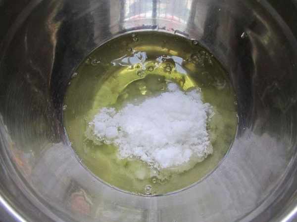 第五步:然後把蛋清中加入白糖和幾滴擰檬汁去腥,用打蛋器攪打。