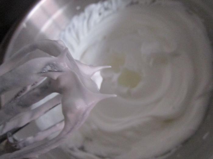 第六步:攪打均勻以後,成為幹性發泡的蛋白霜,最簡單的檢驗辦法就是拿一根筷子插到蛋白霜裏,筷子站住不倒,蛋白霜就是打發好了。