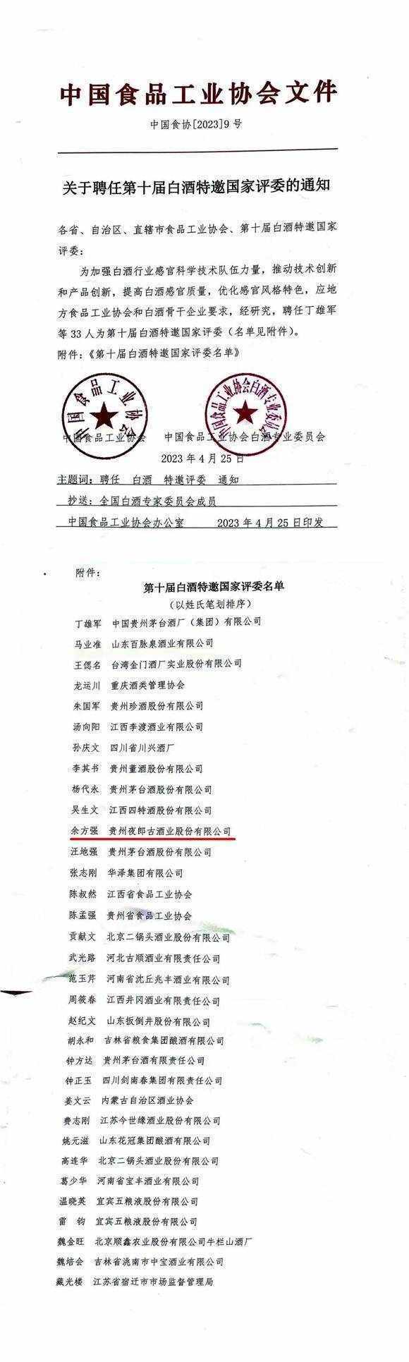 近日,由中國食品工業協會主辦的2023年第十屆白酒國傢評委換屆考評工作圓滿結束,夜郎古酒業董事長餘方強受聘成為“第十屆白酒特邀國傢評委”。通知名單顯示,成為本屆 “白酒特邀國傢評委”的人員包括茅臺集團黨委書記、董事長丁雄軍在內共計33人。