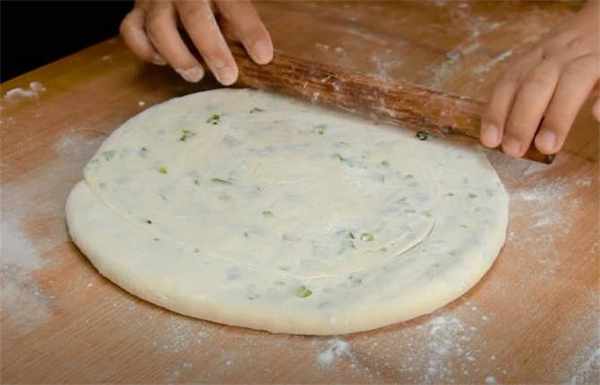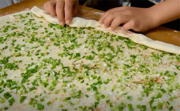 2.大約一個小時,咱們的面就發好瞭,上面多撒一些幹面粉,這個面太黏瞭,把它取出來,案板上再撒一些幹粉,把它揉成團,團一團按扁,然後用搟面杖把它搟開,搟好之後刷上一層油,撒上一些食鹽,再來一些十三香,然後把蔥花放上去,均勻地鋪開,把它這樣從底部一提一拉的方式卷起來。