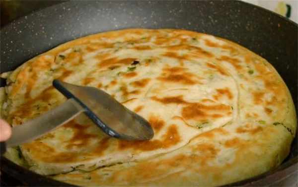 5.鍋用中火預熱好之後就可以刷油瞭,把這個餅胚放進去,蓋上蓋子,用中小火烙大概四五分鐘左右,打開蓋子,表面刷一層油,給它翻個面,蓋上蓋子繼續烙,整體烙瞭大約有七八分鐘左右,咱們這個餅就熟瞭,這樣按下去可以快速回彈就代表熟瞭。