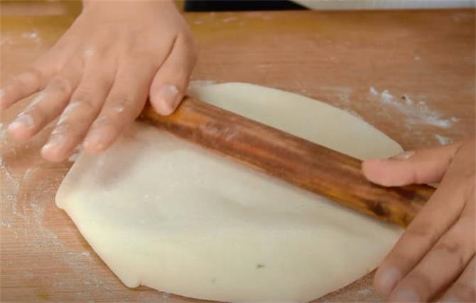 5.把整個餅都包起來,這個邊緣處按壓緊實一些,給它反過來,然後用搟面杖輕輕的把它搟開,註意這個皮不要搟破瞭。