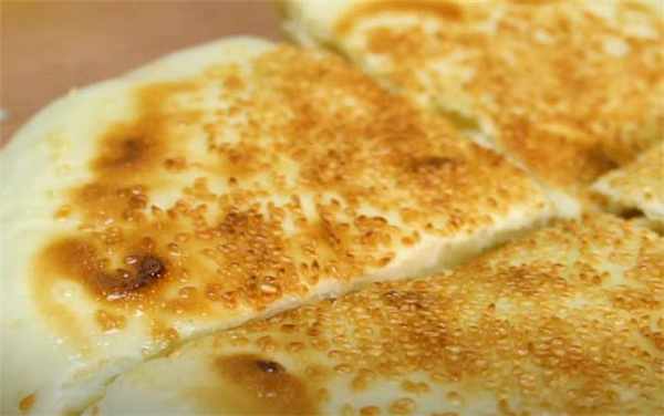 8.電餅鐺刷一些油,把這個餅放進去,煎至底面變色翻個面,像這樣就可以出鍋瞭。