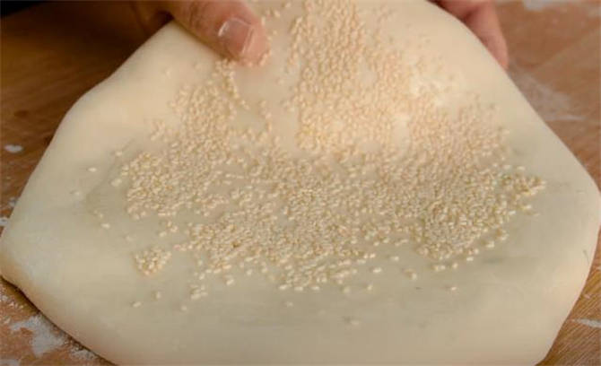6.表面刷一層水,撒一些白芝麻,按一按,現在就可以拿去鍋裡蒸瞭。