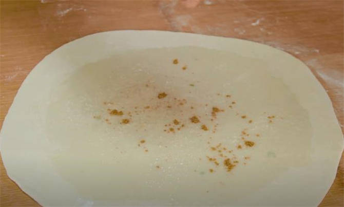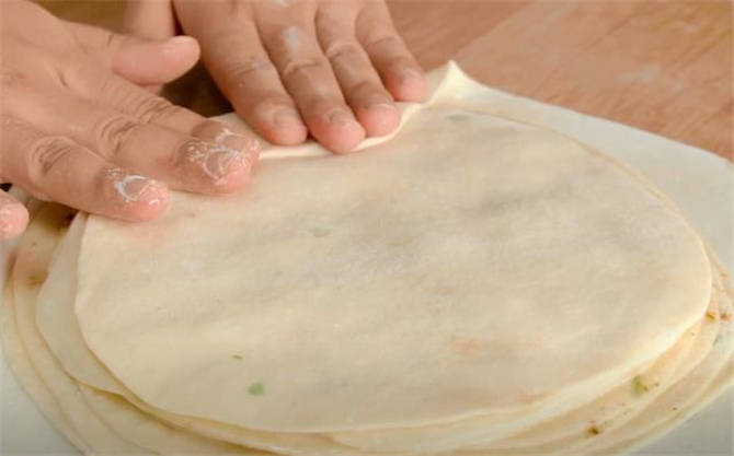 4.再覆蓋一張餅皮,每一張餅皮都像這樣疊一張,再刷一層油,撒一層調料,把最後一張蓋上,然後把下面最大的餅皮往上疊。