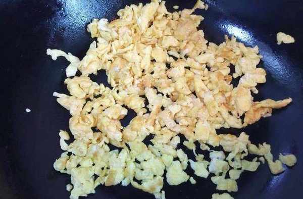 4,起鍋加入少許玉米油,放入蛋液煸炒成熟,這裡最好把雞蛋煸炒成雞蛋碎,這樣可以直接使用,不用再切碎,如上圖所示。