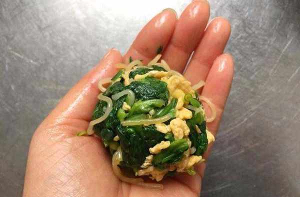 9,把一勺菠菜雞蛋餡團成團,盡量團的緊一些,如上圖所示。