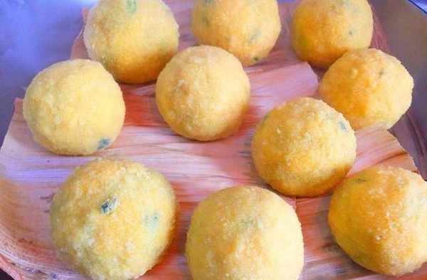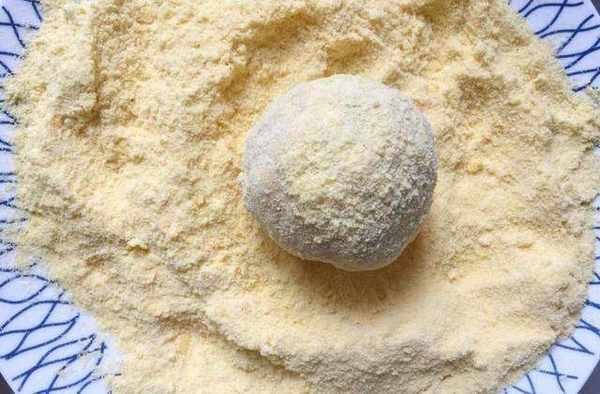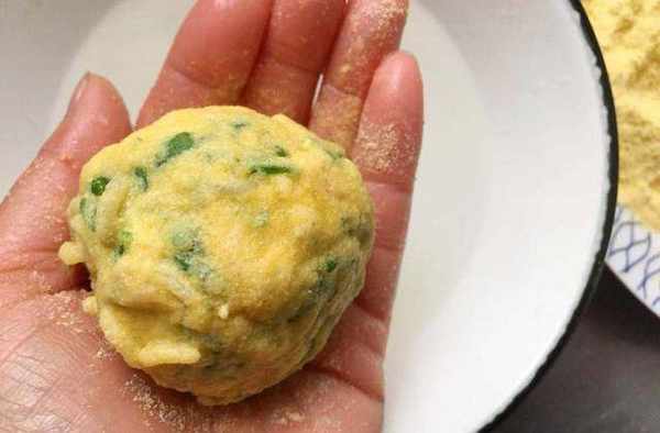 10,接著先在玉米面粉中滾一圈,再用手攥緊實一些,如上圖所示。