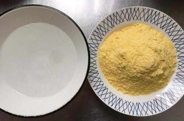 8,準備半碗水和適量的玉米面粉,如上圖所示。