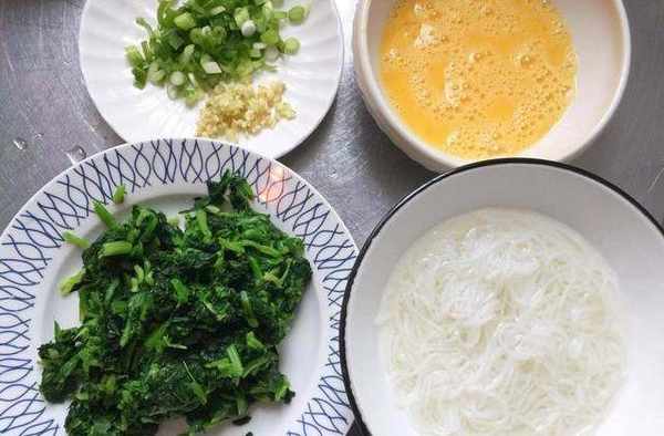 3,菠菜完全冷卻後擠幹水分,再橫、豎各切幾刀,不用切得太碎;雞蛋打散,加入少許食鹽攪拌均勻;魔芋粉絲多清洗幾遍後再用開水燙一會兒;小蔥切成蔥花;生薑切成末,如上圖所示。