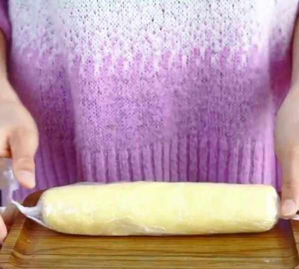 第4步、砧板上鋪上一層保鮮膜,把面團轉移到上面,然後再包緊,搓成一個圓柱體,放入冰箱裡面冷凍一個小時。