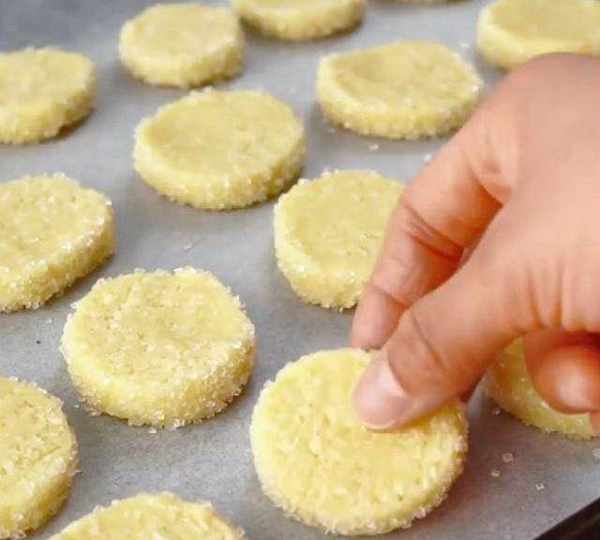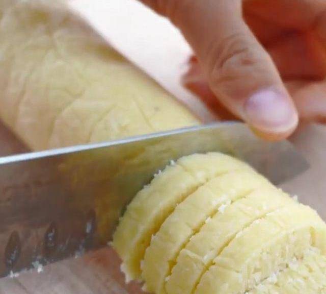 第5步、從冰箱取出,揭去保鮮膜,切成六毫米左右的厚度,然後在周邊裹上一層白砂糖。