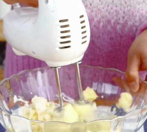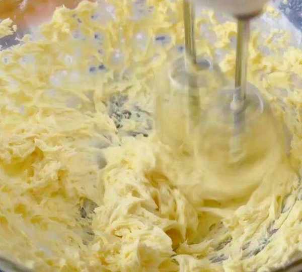第1步、將軟化好的黃油倒入大碗中,加入糖粉,用打蛋器打至完全混合。