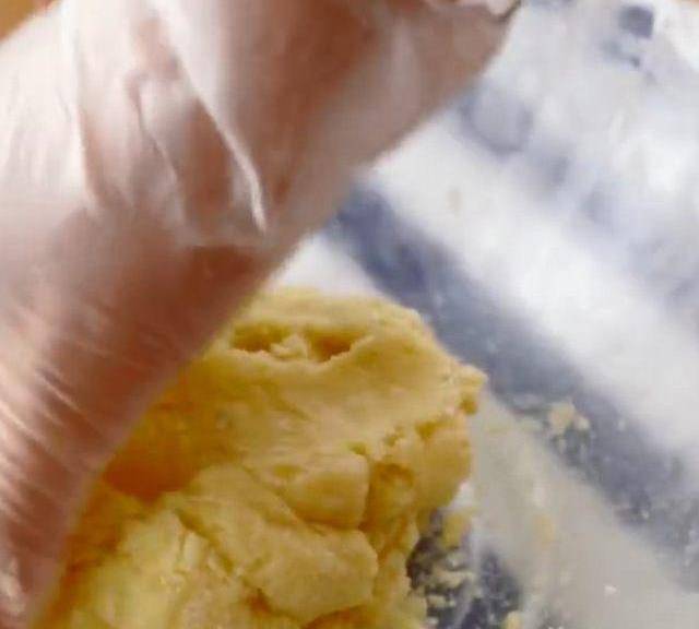 第3步、過篩低筋面粉,再倒入椰蓉,用刮刀混合均勻,然後揉成不軟不硬的面團。