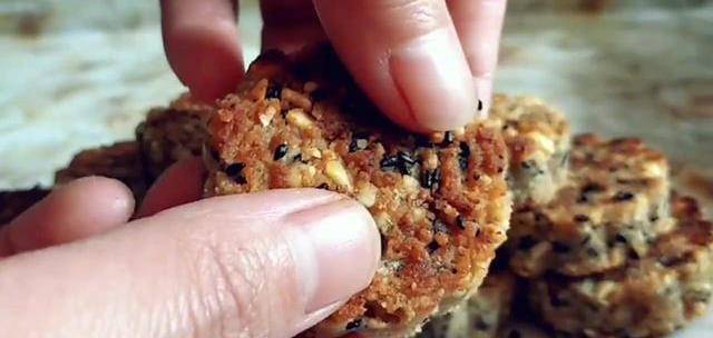 多按壓幾下,讓表面更加平整,全部做好以後,蓋上蓋子,開中火烙三分鐘左右,烙至底部金黃翻面,煎至另一面金黃關火,放涼以後再把它取出來,我們的花生酥就完成瞭,裡面滿滿的花生和黑芝麻越嚼越香,比桃酥還要好吃。