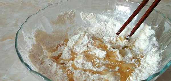 1、首先我們在大碗中倒入300克普通面粉,加入一勺白糖,喜歡吃甜的就多加點。加入30克食用油,用筷子攪拌成絮狀後下手揉成面團。