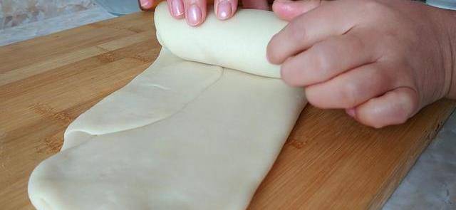 4、搟成長方形後卷起來,再搟成長方形,卷起來,如此重復兩次。