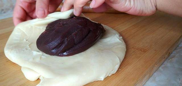 5、搟好後對折一下再搟成圓形。包入豆沙餡。收口處捏緊。