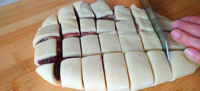 6、搟成一厘米厚。再用刀切成長寬約一厘米到兩厘米的方塊。