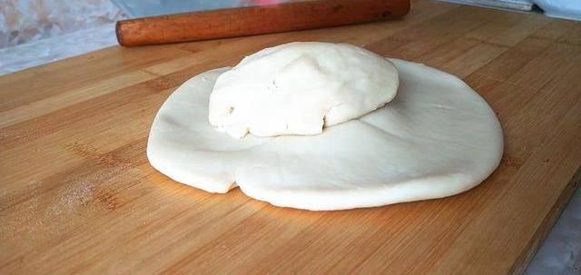 3、面團搟成圓形,包入油酥團。收口處捏緊。