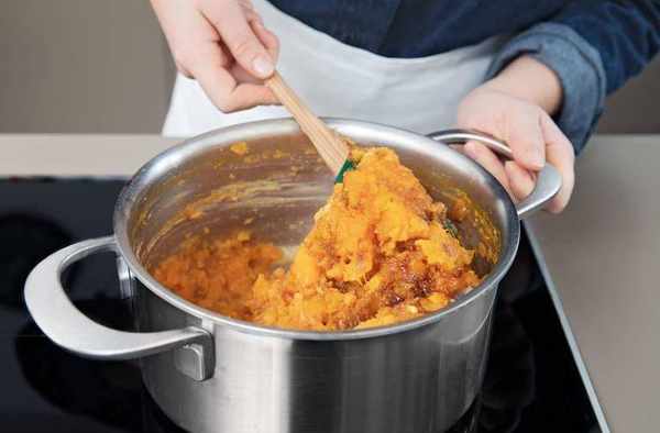 將紅薯放入大鍋中,加水沒過紅薯。加入黃油,煮沸後以中高火煮約20—30分鐘(時間取決於紅薯塊的大小)。煮至紅薯可以用叉子戳穿,註意不要煮糊。倒出鍋中四分之三的水,然後放回火上。