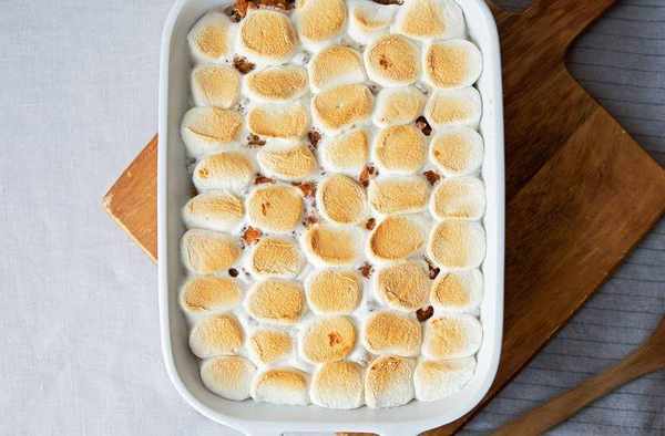 加入花生醬、楓糖漿、香草精和紅糖,攪拌混合均勻。將火力調為小火。如果混合物質地太稀的話,則加入更多的花生醬使質地變稠(你也可以加入更多的楓糖漿來調味)。在鍋的上方鋪上一層棉花糖,在幾分鐘後關火。然後放入預熱至200°C的烤箱,烤約10分鐘,或者至棉花糖變為棕色。盡情享用吧!