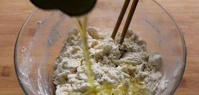 我們先準備135克的溫水,水溫35度最適合酵母發酵,倒入三克酵母,攪拌均勻,放一旁靜置兩分鐘,我們再準備300克的普通面粉,倒入30克白糖,加上一克鹽,把它們攪拌一下,倒入剛剛靜置好的酵母水,邊倒邊攪拌,攪拌至沒有幹面粉,倒入50克的食用油,下手揉成偏硬一點的面團。