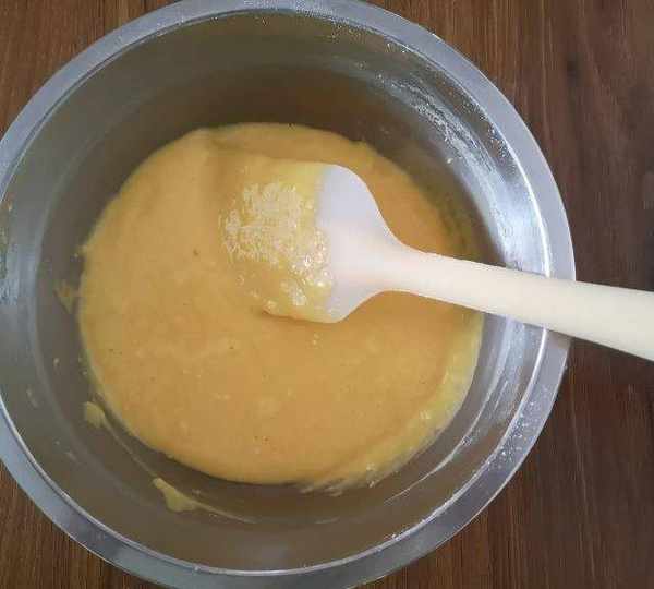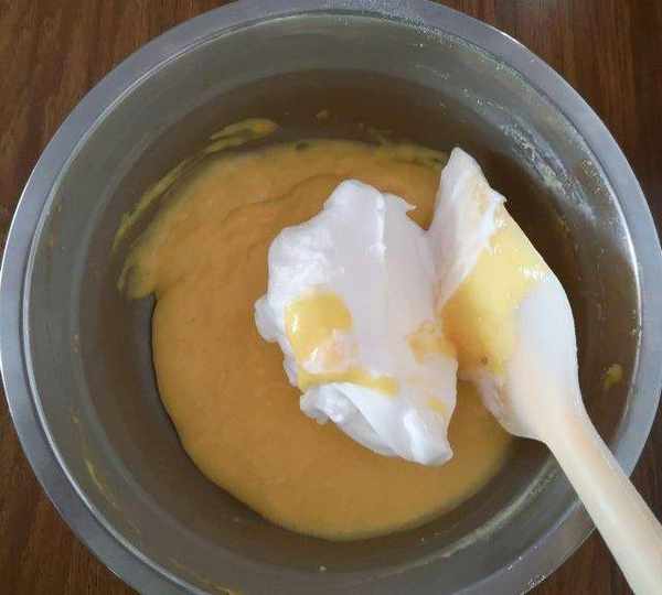第9步、將三分之一的蛋白糊加到蛋黃糊中,用刮刀輕輕地翻拌均勻。