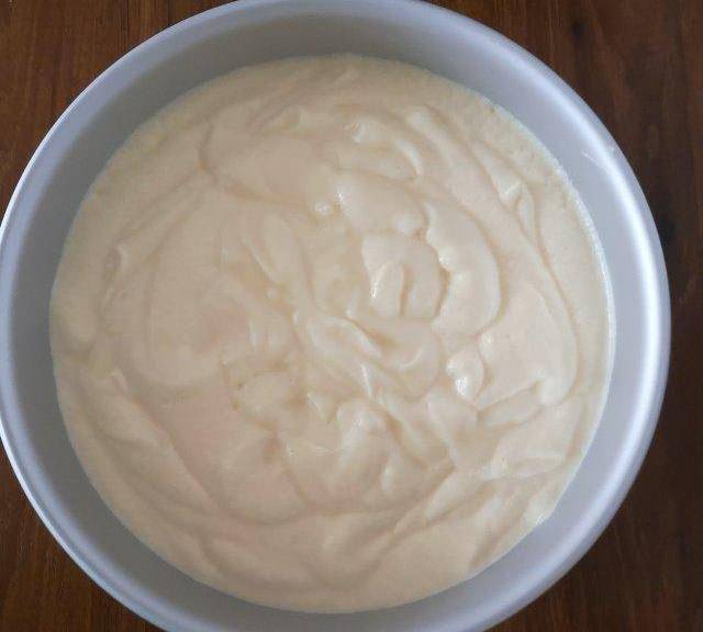 第11步、攪拌好的面糊倒八寸的蛋糕模具裡,並在桌面上震幾下,震出面糊中的氣泡。放入已經預熱好的烤箱,上火160度,下火160度,烤32分鐘。表面金黃色,用牙簽插入蛋糕體拔出時沒有濕面糊即可取出,在桌面上震一下。