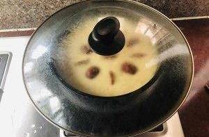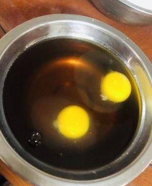 紅糖水涼瞭之後打入兩個雞蛋攪拌一下