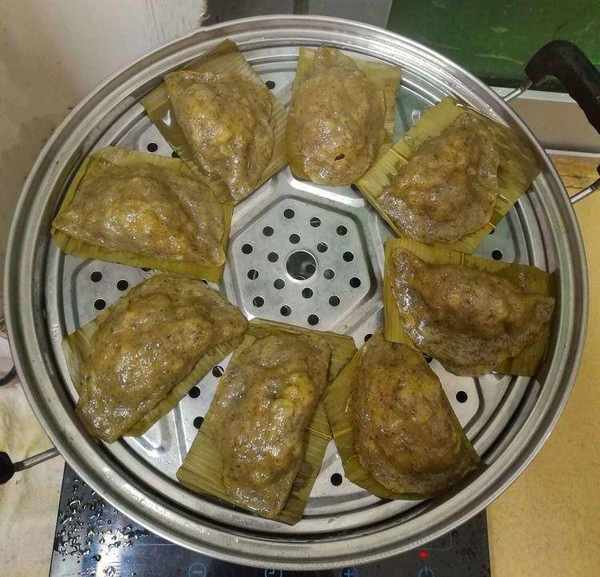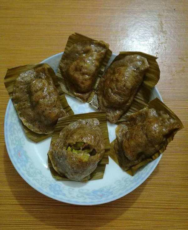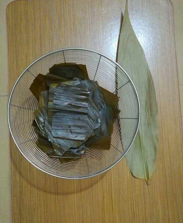 做艾籺前,先要準備一些籺墊,籺墊的作用是防止蒸的時候會粘鍋,同時是儲存和吃的時候取用方便。籺墊的材料多種多樣,有用菠蘿蜜的葉子的,有用菜葉子的,有用粽葉的,無論用哪一種,都要預先摘來洗幹凈,用開水燙過或煮過,然後用剪刀剪成需要的大小和形狀。這次我用的是粽葉,粽葉也有一種特殊的清香,和艾香混在一起相得益彰。