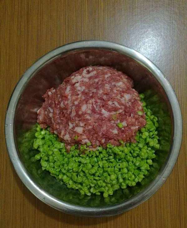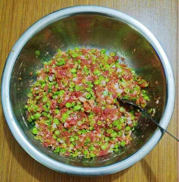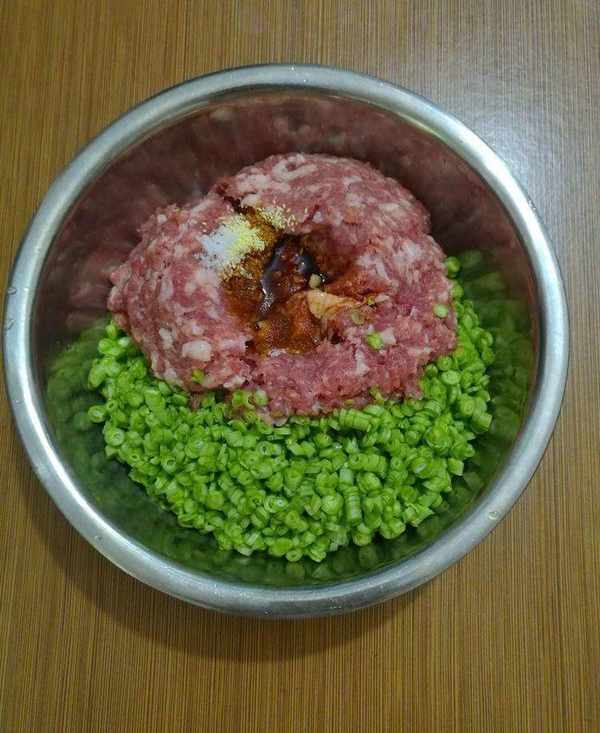 把豆角洗幹凈切碎,把豬肉剁碎,加入鹽、生抽、味粉,攪拌均勻成餡料備用。