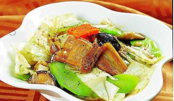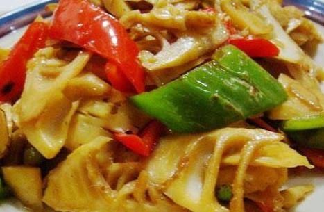 2、起鍋熱油,先放入筍片翻炒至略有金黃色,再放入尖椒,快速炒幾下.同時加入生抽、少量白糖、蘑菇精.再淋上少許水分.炒至色澤均勻即可。