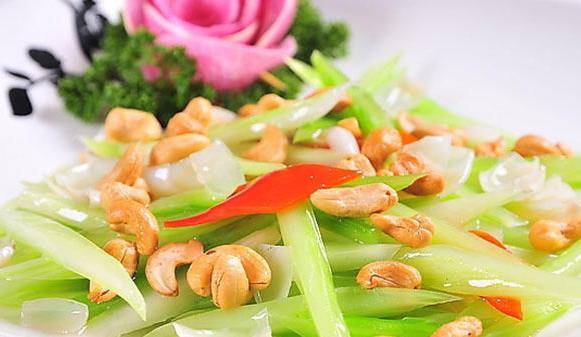 1、西芹洗凈削皮,切成菱形塊;百合掰開洗凈;腰果用油炸熟備用;
