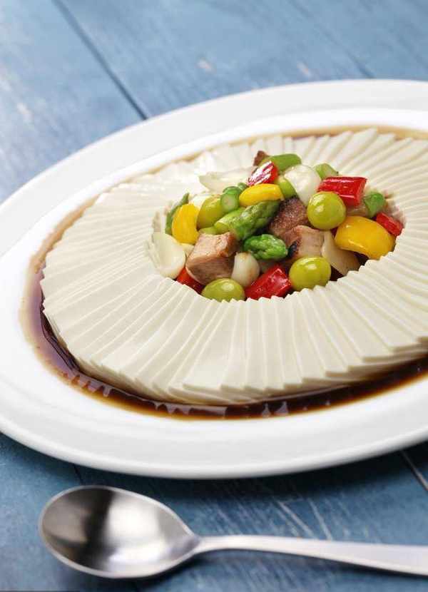 1、豆腐切大塊?6?5放入面粉、鹽調制的面糊中掛糊,再放入油鍋中炸至金黃色,撈出,控幹油;