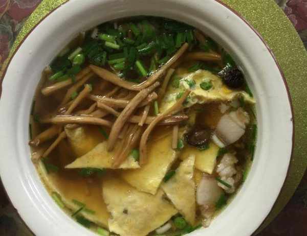 三鮮湯:雞蛋去殼裝碗打散,加入玉米粒、青豆拌勻。鍋內放入適量的食用油,鍋加熱倒入蛋液,將蛋煎熟取出,涼透後切成塊備用。將泡發好的黃花菜、香菇在鍋內加水燒熟,將熟蛋片倒入鍋內繼續煮10分鐘左右。放入少許鹽、胡椒粉、蔥花、少許醬油拌勻即可,鮮美的一道湯就好瞭。