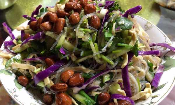 什錦菜:先將粉絲、金針菇、百葉絲焯水焯熟備用。黃瓜切絲、紫包菜切絲備用,將熟粉絲、熟金針菇、熟百葉絲、黃瓜絲、紫包菜、蔥花拌勻。然後加入所有輔料拌勻即可裝盤,再撒上花生米即可食用。你這樣做過嗎?
