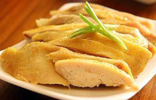 白斬雞,蔥、薑、精鹽分盛二小蝶,拌勻。用中火燒熱炒鍋,下油燒至微沸,取出,分別淋在二小碟上,供佐膳用;將雞洗凈,放水中凈煮,中間提出兩次,倒出腔中的水,以保持內外溫度一致。約浸十五分鐘至熟,用鐵鉤勾起,再放在冷開水中浸沒冷卻,並洗去絨毛、黃衣,隨即撈起。晾幹表皮,澆上熟花生油,斬成小塊,盛入碟中,擺成雞形。吃時佐以薑茸、蔥絲這樣才是最美味的吃法。