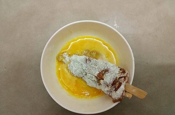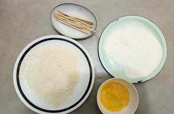 5.準備輔料:1個雞蛋打散、1碗面包糠、玉米淀粉、準備14根肉串簽子備用