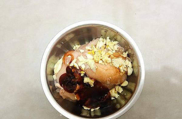 3.處理好的雞肉放入容器中,加入切好的蒜末、蠔油、生抽、料酒、少許薑粉、白胡椒粉等調料