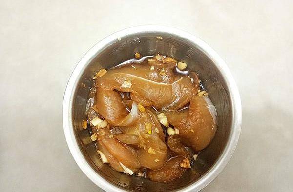 1.準備食材,雞胸肉、生抽、蠔油、大蒜、白胡椒粉、薑粉、料酒等