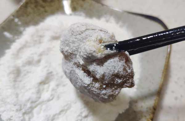 4,接著把雞塊迅速地放面粉裡面滾一圈,讓雞塊全部沾上面粉: