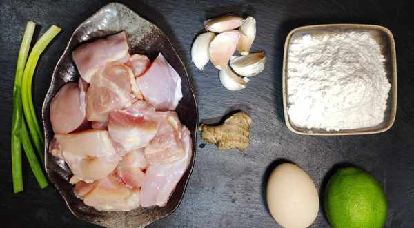 食材:雞腿肉500克、雞蛋2個、面粉50克,檸檬、蔥花、蒜米、薑片、料酒、胡椒粉、鹽、糖、醬油等